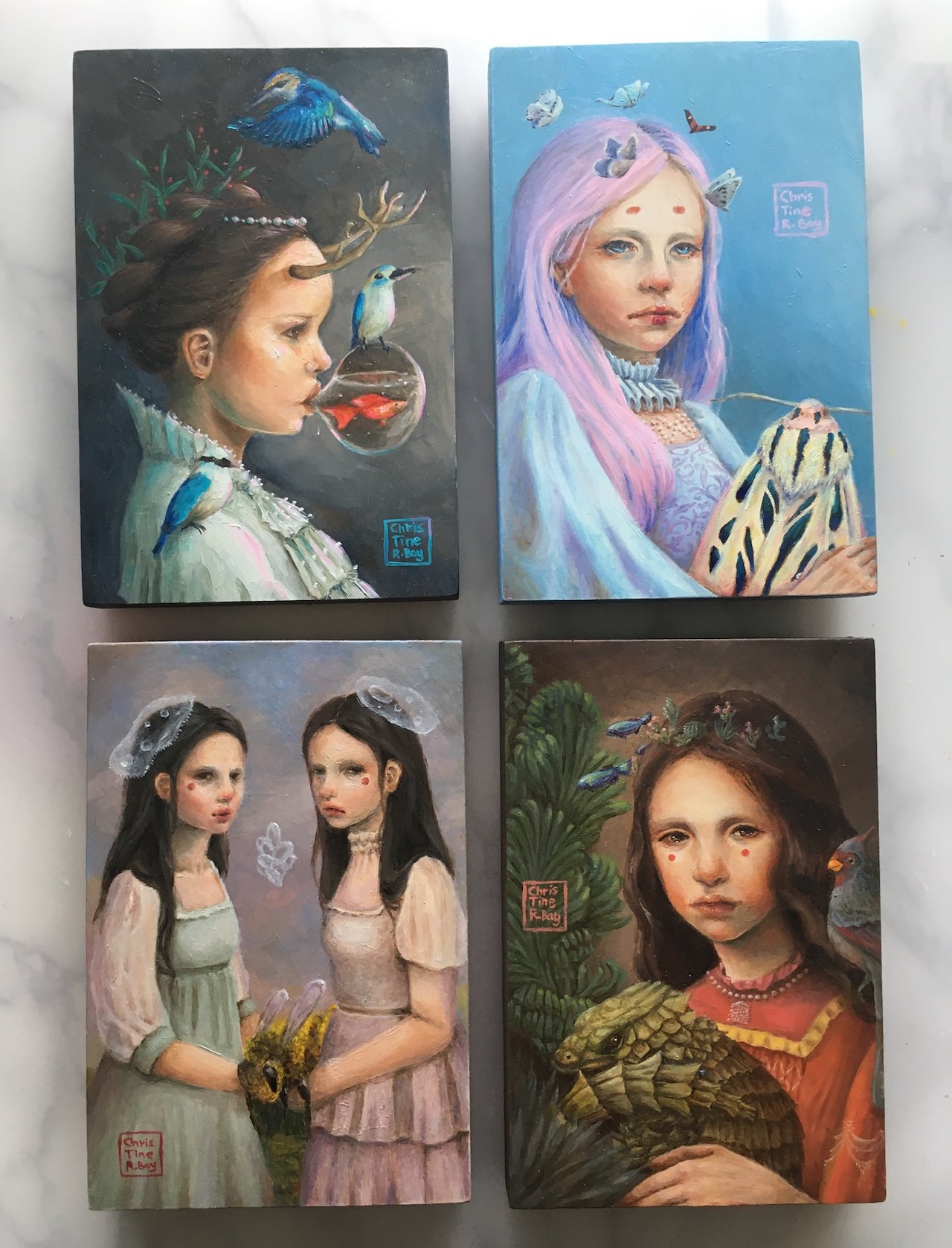 Clockwise from top-left: 1) The Mangrove Keeper 2) The Lepidoptera Hime 3) Oasis Nymph & 4) The Beginning (All are painted with oils on 4" x 6" gessoed panel)