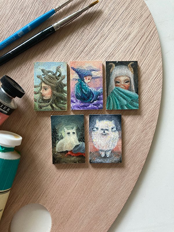 All are painted with oils on 1" x 1.5" primed wooden panels.
