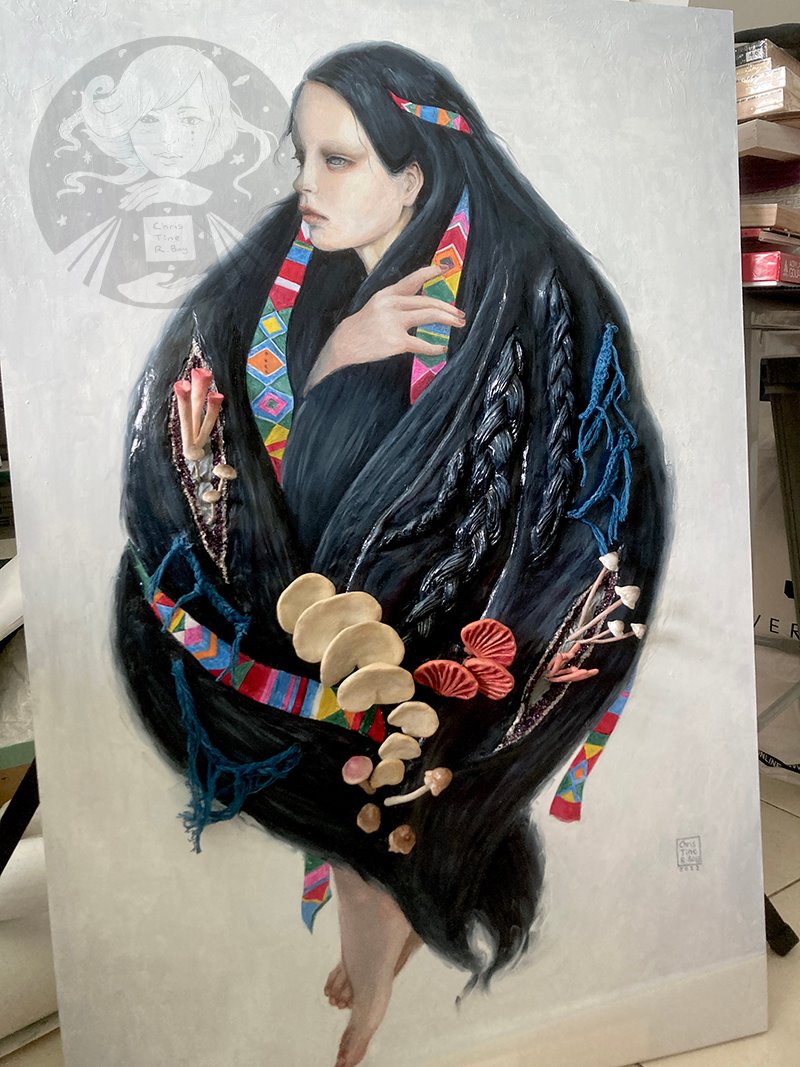 For my painting, it is a mixed media piece with sculptural elements using oils, epoxy clay, spray primer, acrylic gouache, various mediums and yarn on gessoed 60cm x 90cm wooden panel. I experimented with gessos of different thickness and textures for this piece.