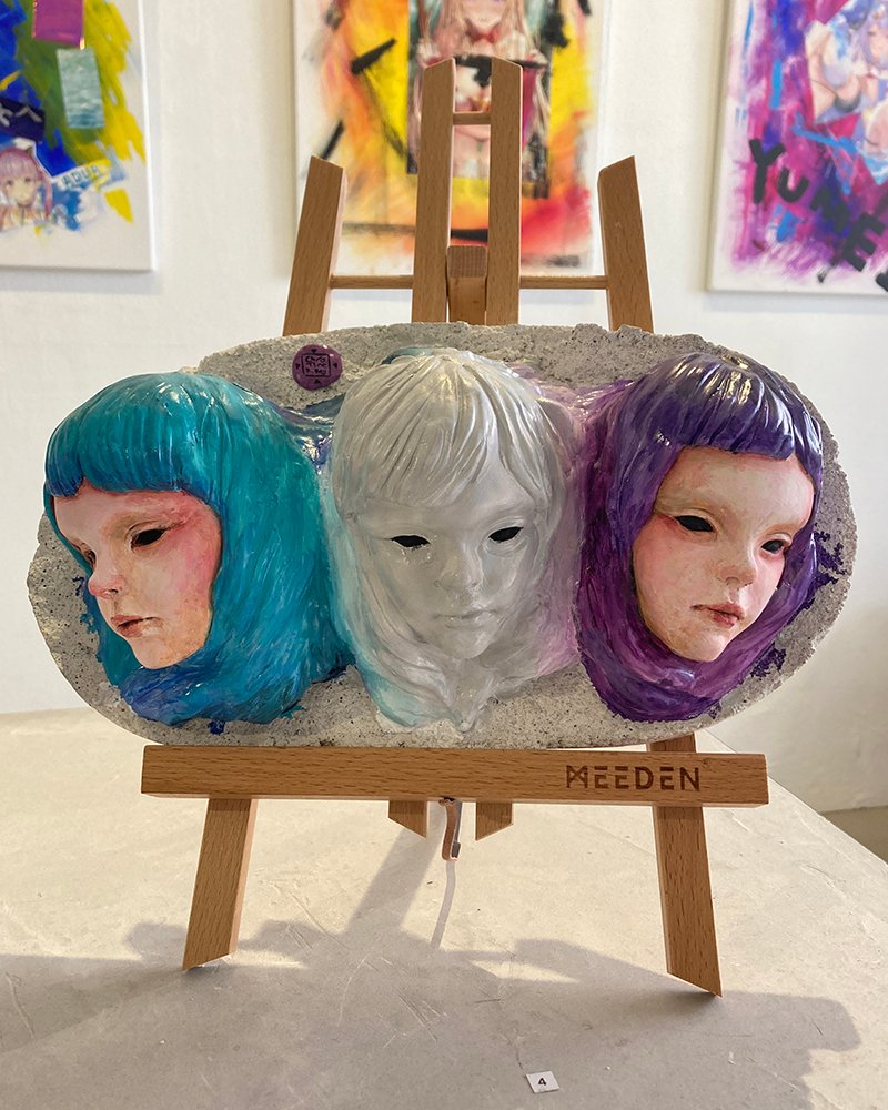 Despite having dissimilar artistic themes, BODHI, MOMO and Christine R. Bay present similarly vibrant artworks with complimentary styles composed mainly of figures integrated with abstract compositions within each artwork.