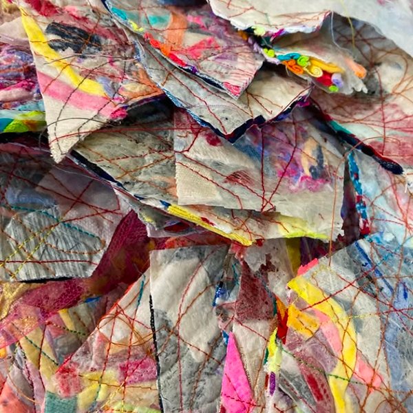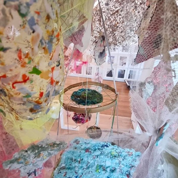 Medium: Discarded garments, textiles and yarn; waste papers, natural binders, expired silicone rubber and resin; discarded wax, bamboo, wood, string